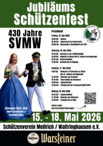 « Alle Veranstaltungen Schützenfest 2026 Mai 15 - Mai 18 Zum Kalender hinzufügen Google Kalender iCalendar Outlook 365 Outlook Live Details Beginn: Mai 15 Ende: Mai 18